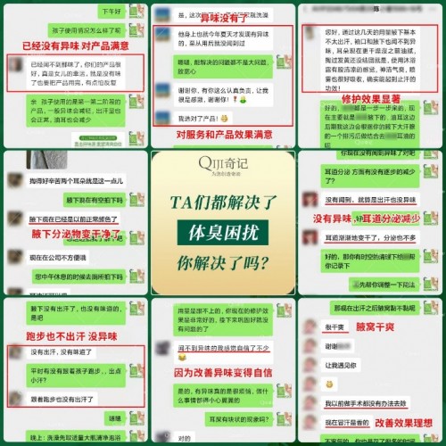 奇记深耕净味行业多年,深入贯彻“针对性产品及方案与一对一服务相结合”的理念,自创立以来,已帮助超过10万的用户调理腋下异味问题。卓越的净味效果已帮助无数用户重拾清爽自信形象,深受消费者的认可和信赖。